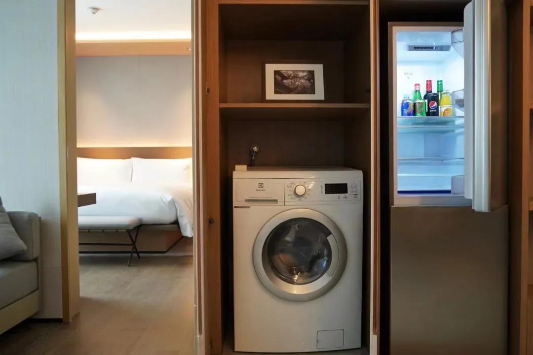 房间还配备了大型的冰箱,可以冷冻和冷藏各种美食和饮料。同时还有一个洗烘一体的洗衣机,如果入住时间长的宾客,更不要担心洗衣服的事情。