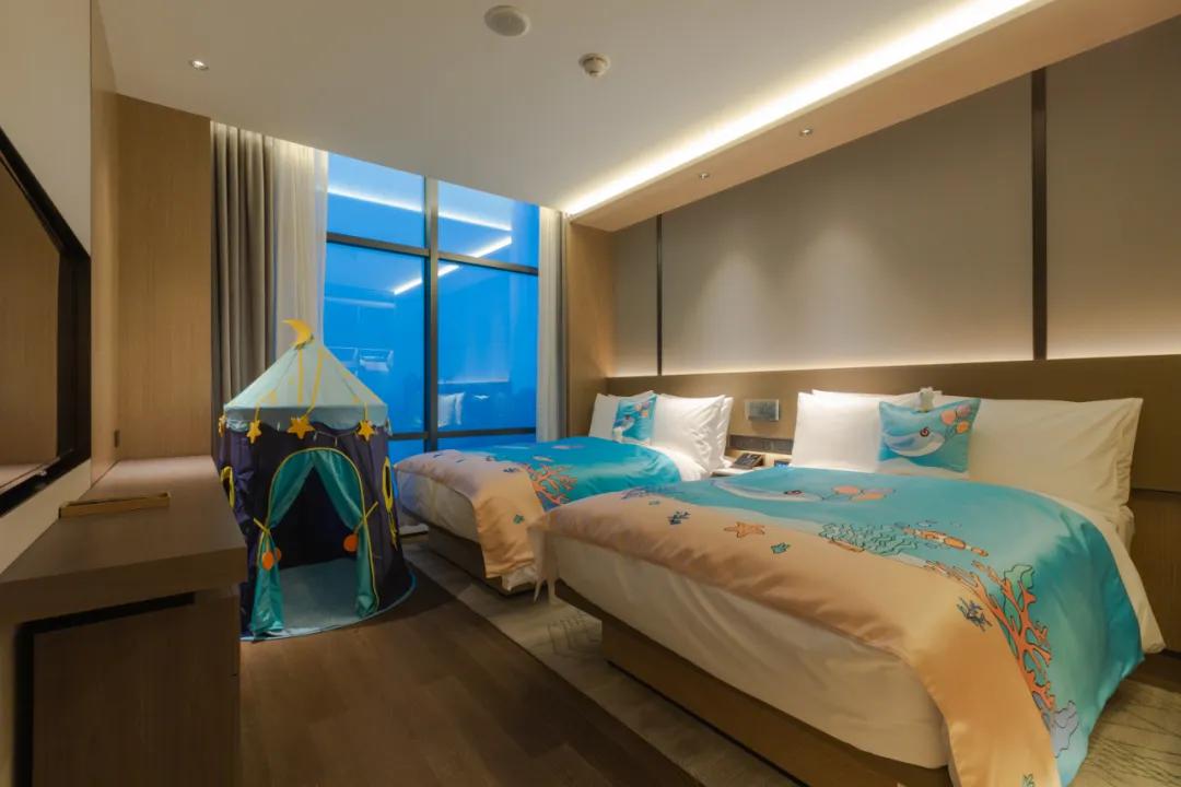 二居室的室内空间,更加宽敞,同时配备的双床房,装扮成海洋元素风格,想必接下来比较受亲子家庭的青睐了。