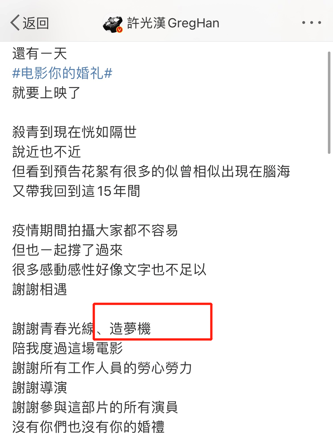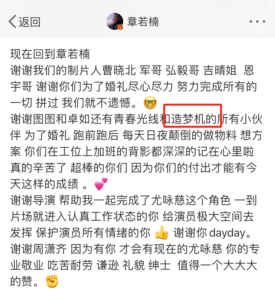 影片上映时,许光汉和章若楠都发布了相当zqsg的小作文来感谢剧组成员和韩天导演,章若楠还提到韩天导演很善于保护演员情绪、给演员发挥空间,隔着屏幕都感受到了导演和演员间的惺惺相惜。剧组氛围这么有爱,难怪电影能取得这样的好成绩!在仔细阅读了主演们的小作文后,突然发现大家都提到了一家比较陌生的公司——造梦机。
