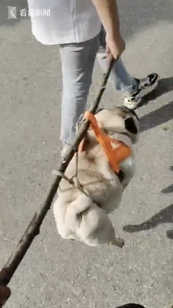 视频中,张先生和家人用一根木棍提着哈尼身上的背带走,模样着实好笑,哈尼也不闹也不动,仿佛很享受这样的待遇。