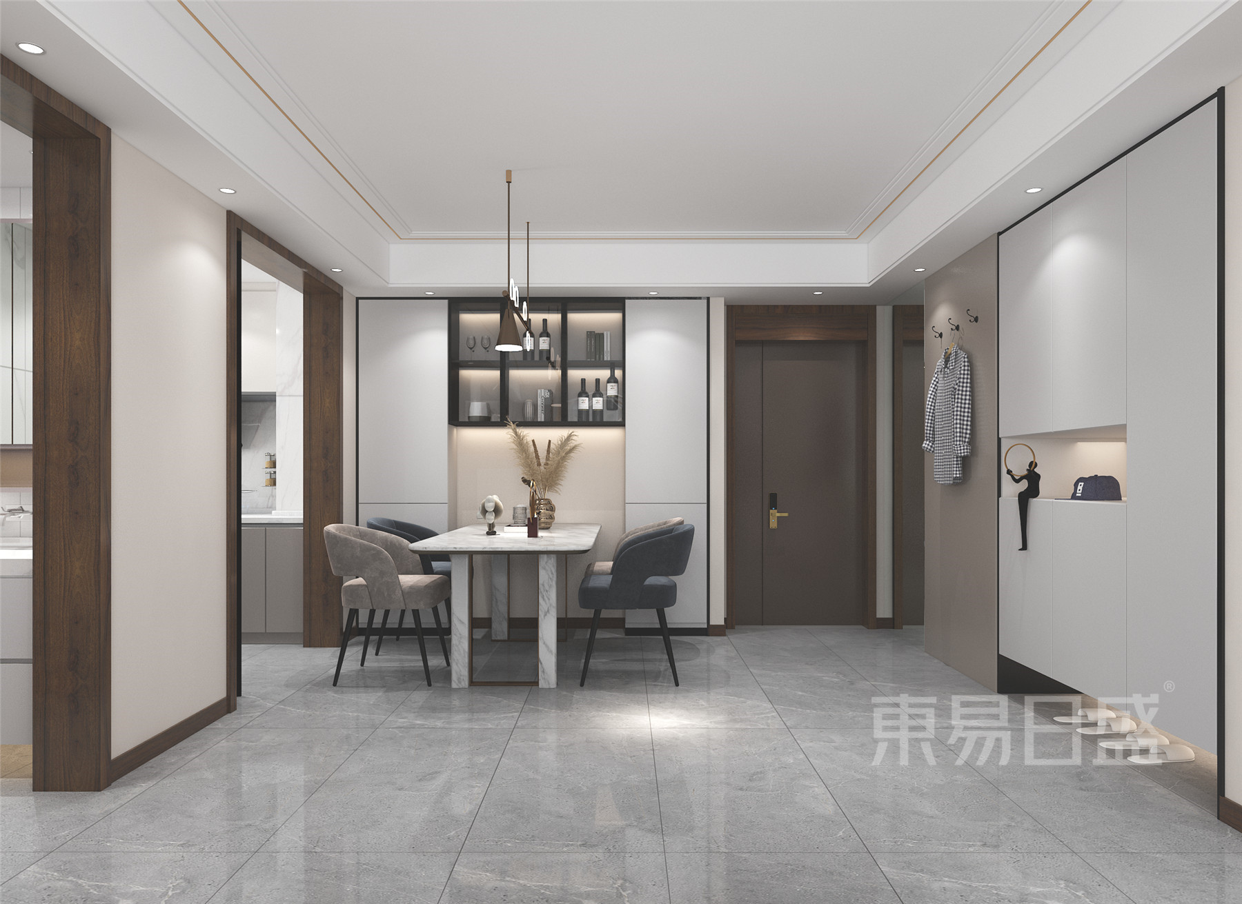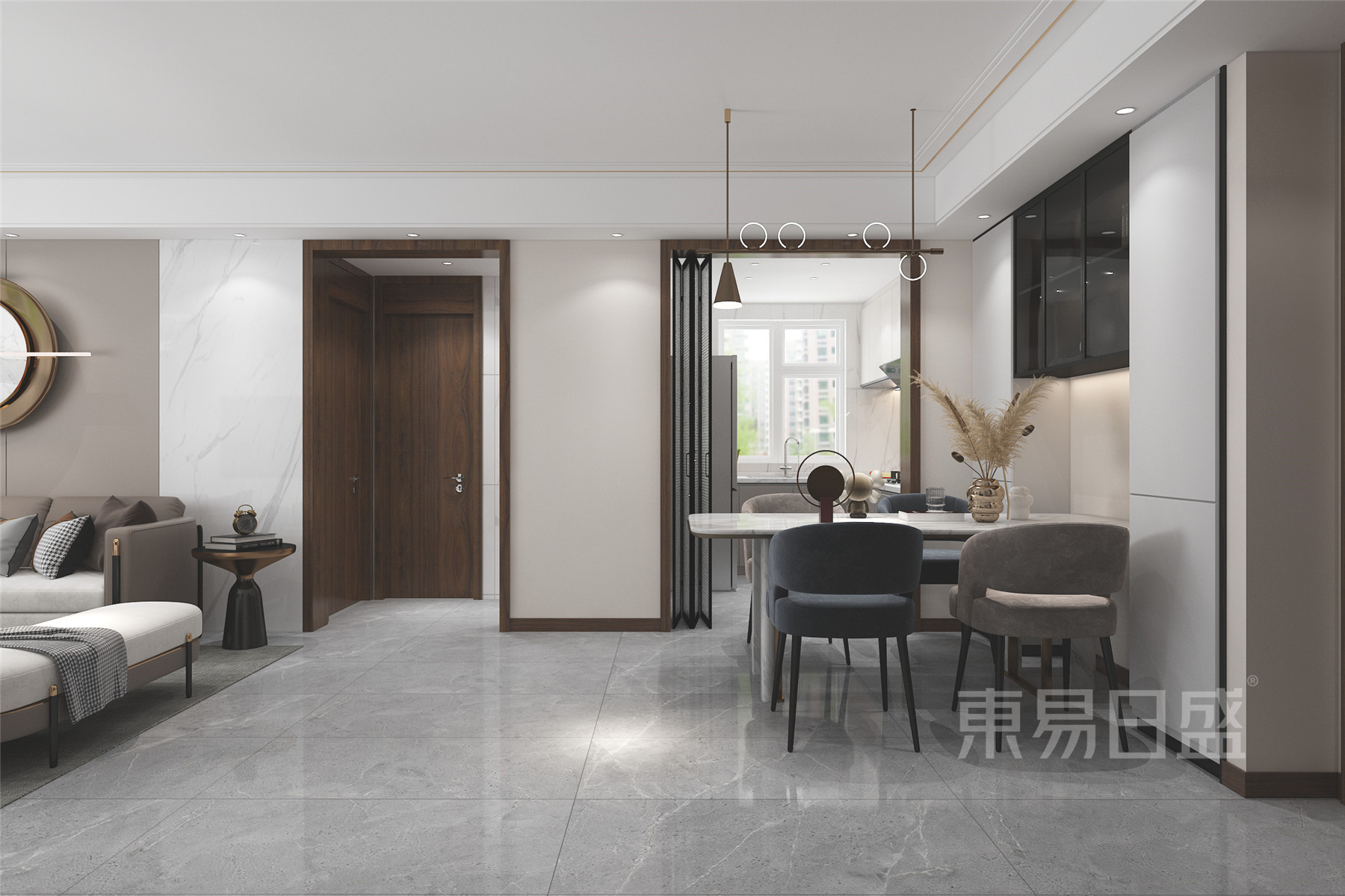 餐厅简约时尚,没有繁复的造型,旁边对称陈列的储物柜,解决居家收纳问题。