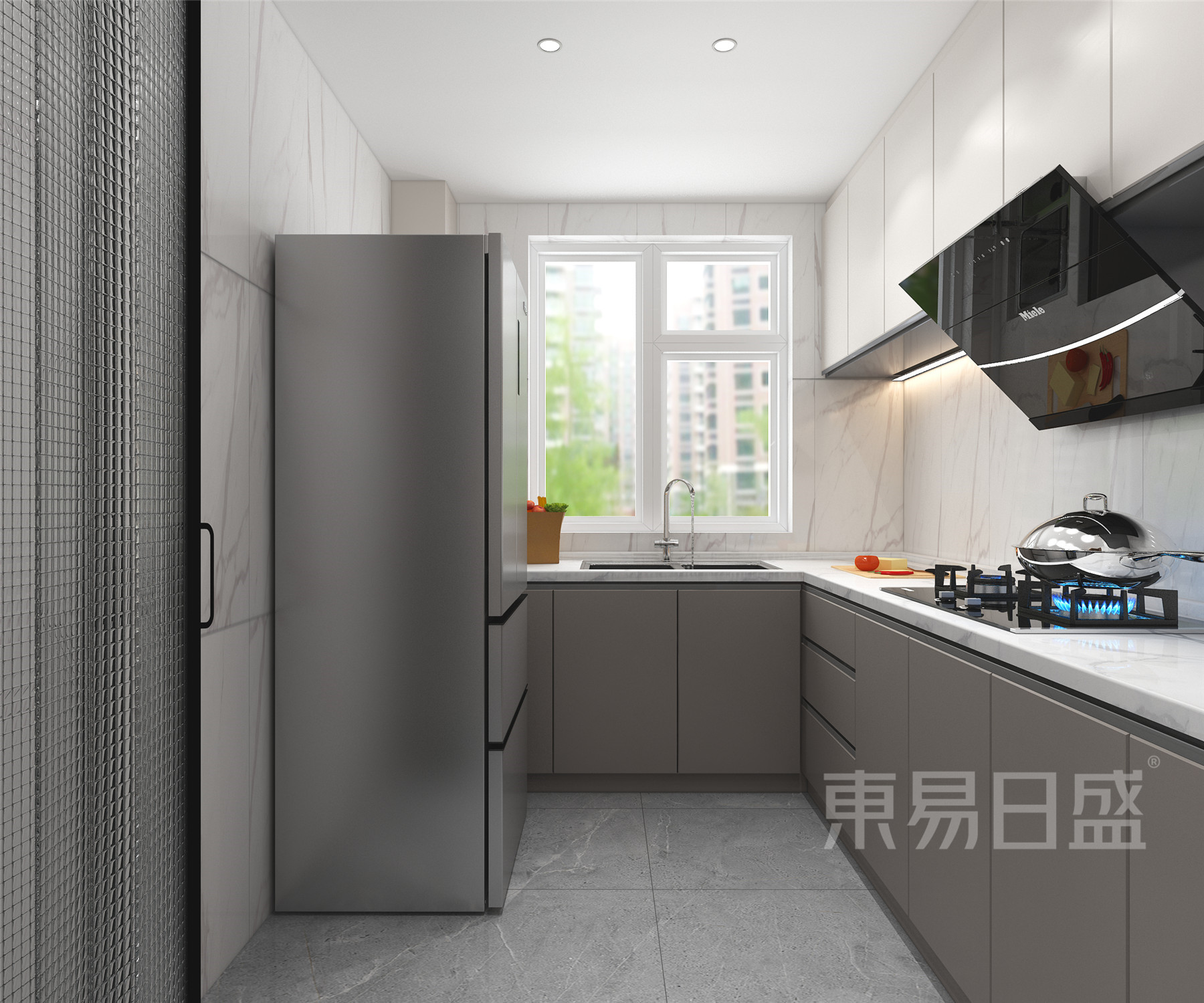 L型操作台,白色与咖色橱柜的设计,也让做饭空间更加优雅自然。