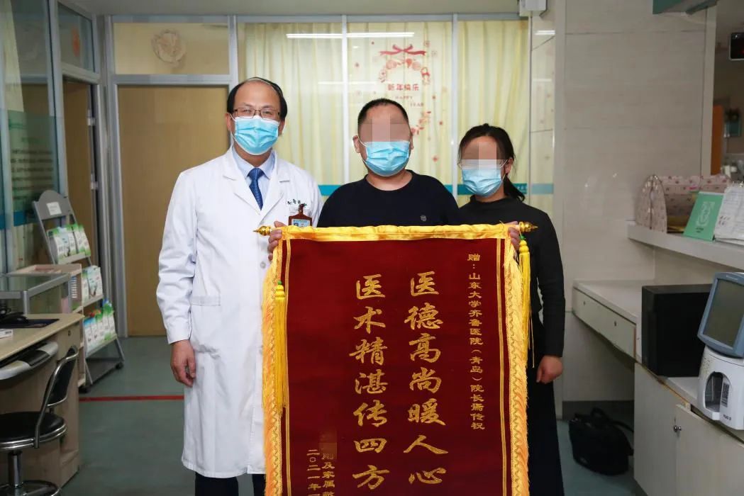 2021年1月13日,第一次走着来到齐鲁医院青岛院区,逯先生和妻子专门制作了锦旗送给焉传祝教授带领的神经内科团队并表示:“语言和锦旗都无法表达我们心中的感恩之情,是焉院长团队让我们获得了重生。”