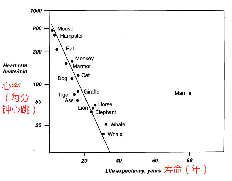 如下图所示,大象的心率为40次/分钟,能活30年;而老鼠的心率接近600次/分钟,寿命仅有1年。