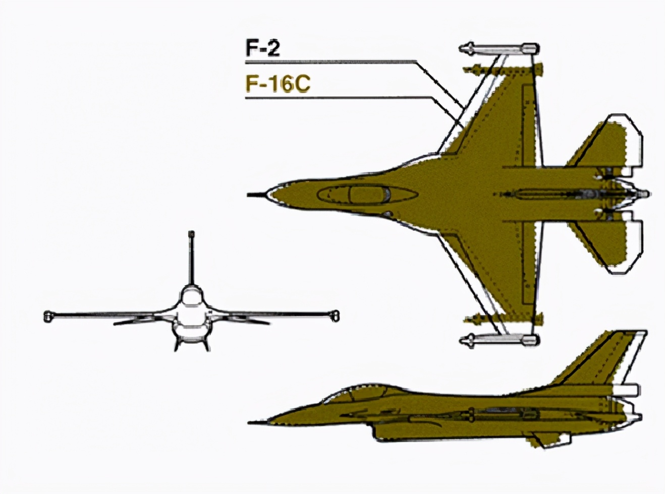由于日本自身并没有完善的航空工业技术基础,包括用于飞机气动外形验证的风洞也没有,所以F-2战斗机的设计很大程度上参考了美国的F-16C/D block40型战斗机的设计,但是为了能够多载弹药,日本在F-16C/D战斗机基础上进行了放大,让F-2战斗机的机翼面积比F-16增加约25%,从而提高了飞机的载荷能力。在执行对地打击任务时,F-2战斗机最多可以携带12枚227公斤(500磅)炸弹;在执行反舰任务时,F-2战斗机可以携带4枚ASM-2或者ASM-3反舰导弹,载荷能力优于F-16战斗机。