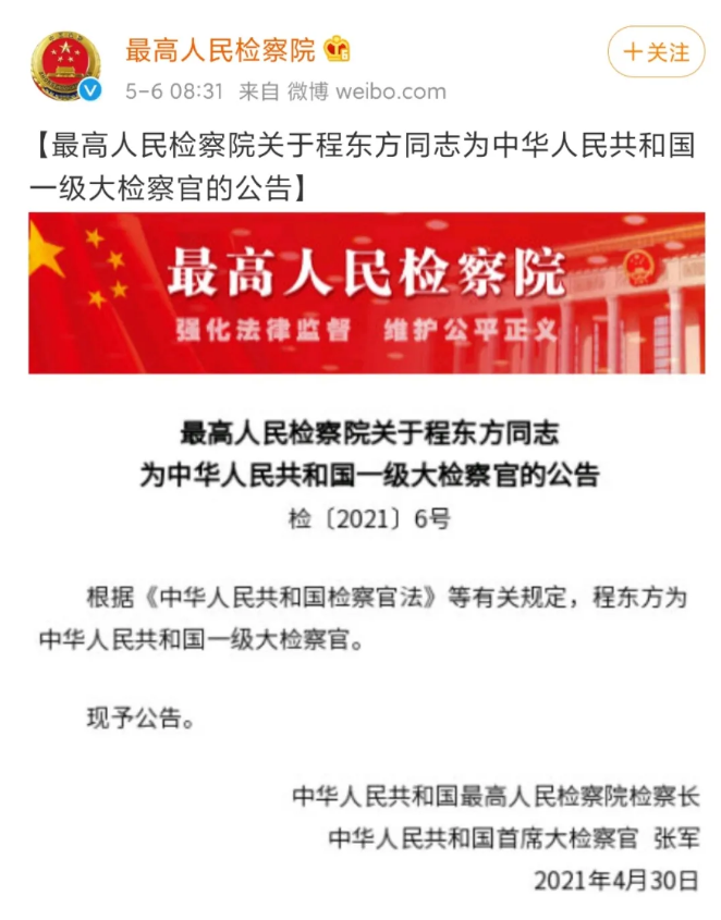 据最高人民检察院官方微博5月6日消息,最高人民检察院发布关于程东方同志为中华人民共和国一级大检察官的公告,刚履新中国人民解放军军事检察院检察长的程东方同志已于4月30日被任命为中华人民共和国一级大检察官。