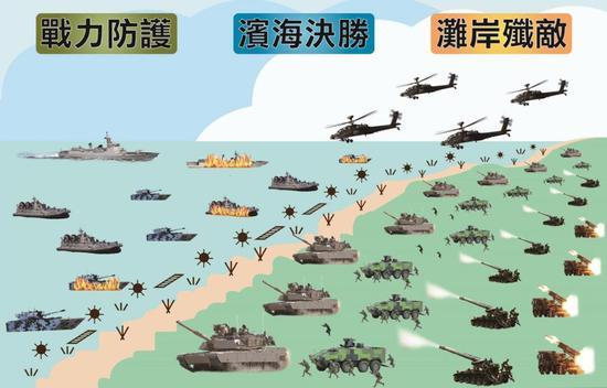 台陆军退役“少将”于北辰透过这几年的汉光军演,分析出了台军反登陆作战体系实施过程的三个主要阶段。第一,预警系统锁定目标,主要是侦察通信卫星配合海、陆、空军队岸置雷达,争取第一时间锁定目标,达到先发制人的效果。第二,海空联合拦截打击,即空军战机搭伙水面舰艇对登陆部队及其空中支援部队实行火力打击与拦截,阻碍登陆。第三,岸滩联合作战,台军将陆地距海岸线10公里的范围内作为理想岸滩交战地段,由陆军配合海军陆战队依托阻碍工事及地雷等防御武器阻止登陆部队向纵深发起进攻,并利用地形优势居高临下火力压制这片区域。