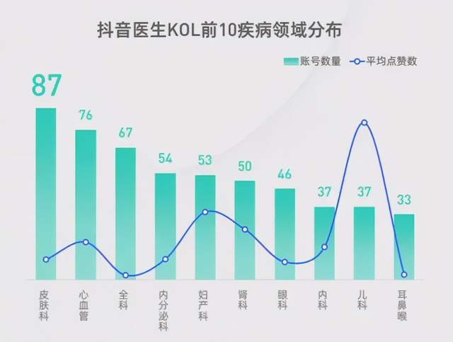新榜报告显示:从已明确疾病领域的医生分布来看,抖音医生KOL前10疾病领域分布依次为,皮肤科、心血管、全科、内分泌科、妇产科、肾科、眼科、内科、儿科和耳鼻喉科。这意味着,上述十大疾病类短视频内容,已成为平台用户的刚性需求。