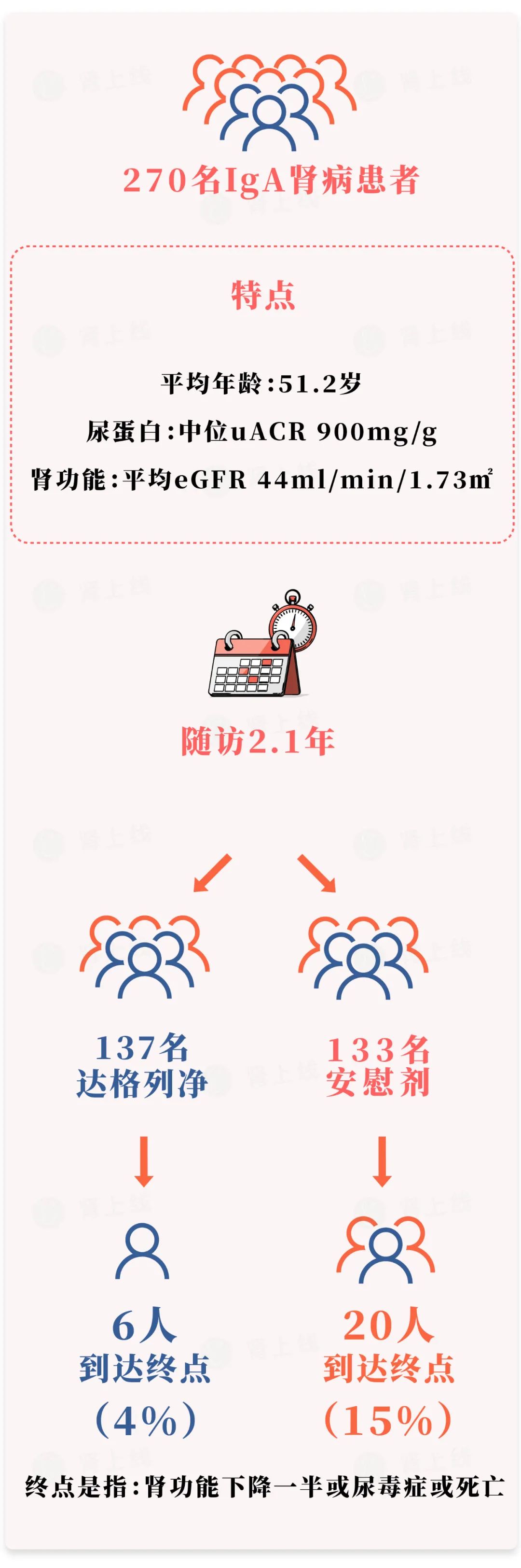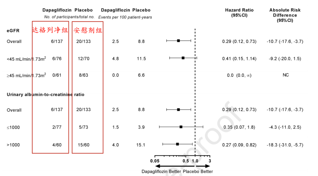 其中137名接受达格列净治疗,133名接受安慰剂治疗,平均随访了2.1年。该试验观察的主要终点包括:eGFR下降50%,或终末期肾病、因肾病或心血管疾病死亡。