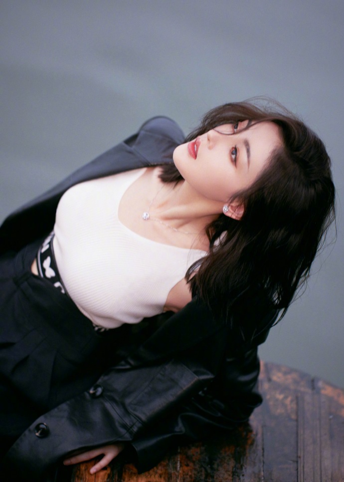 照片中,张天爱外穿黑色皮衣外套,内搭一件白色露脐紧身小背心,好身材暴露无遗。