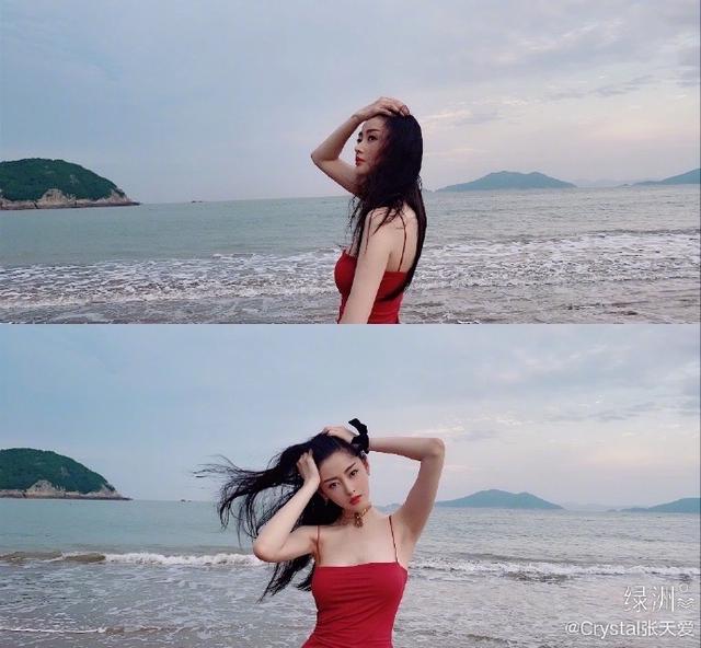 不知道大家是否记得张天爱穿着红色吊带裙的海边名场面,当天的她身穿大红色紧身小吊带,玲珑有致的身材展现得淋漓尽致↓