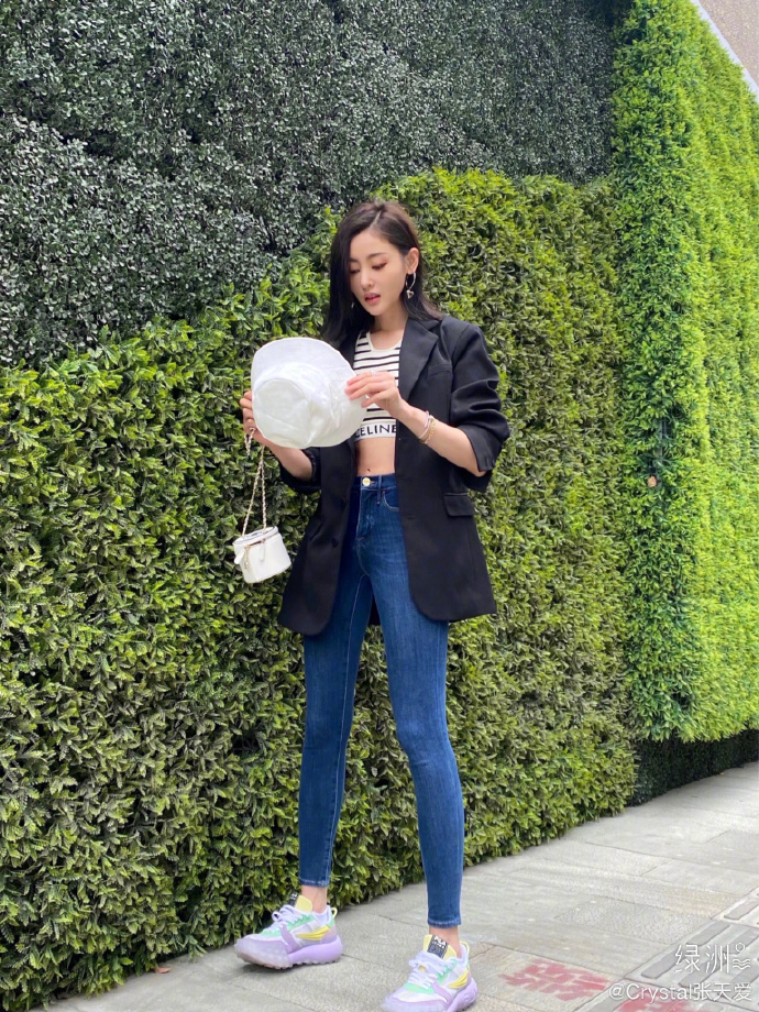 有身材实力,初夏的天气,就特别适合张天爱这样露脐的装扮,既能展现出好身材,又充满时尚感。