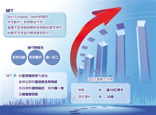 NFT是Non-Fungible Token的缩写,中文称为“非同质化代币”,是基于区块链背景的非同质化数字资产,与比特币、以太币相似又有所区别。它不可分割、不可替代、独一无二。NFT以区块链技术为基础,能够证明其原创性及所有权,各自拥有独特标识、具有唯一性,且极难被窃取。以数字艺术品为具体表现形式的NFT因此得到市场青睐。