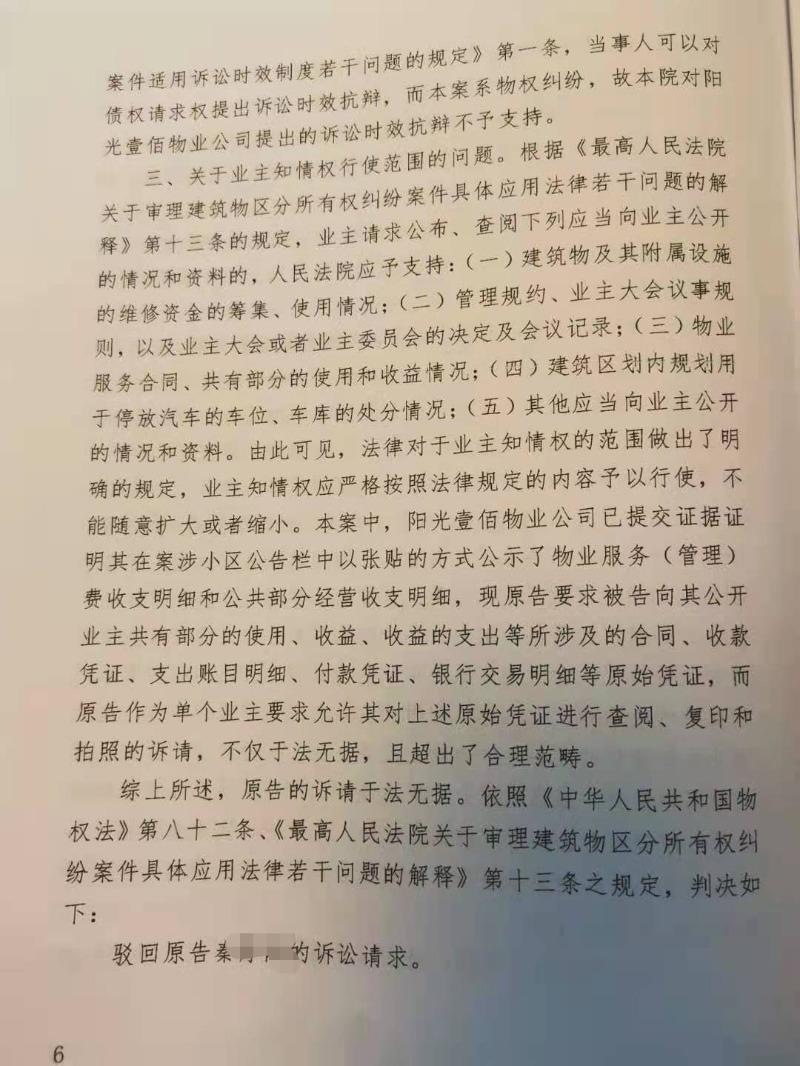 法院认为,该案中,阳光壹佰物业公司已提交证据证明其在案涉小区公告栏中以张贴的方式公示了物业服务 ( 管理 ) 费收支明细和公共部分经营收支明细,现原告要求被告向其公开业主共有部分的使用、收益、收益的支出等所涉及的合同、收款凭证、支出账目明细、付款凭证、银行交易明细等原始凭证,而原告作为单个业主要求允许其对上述原始凭证进行查阅、复印和拍照的诉请,不仅于法无据,且超出了合理范畴。