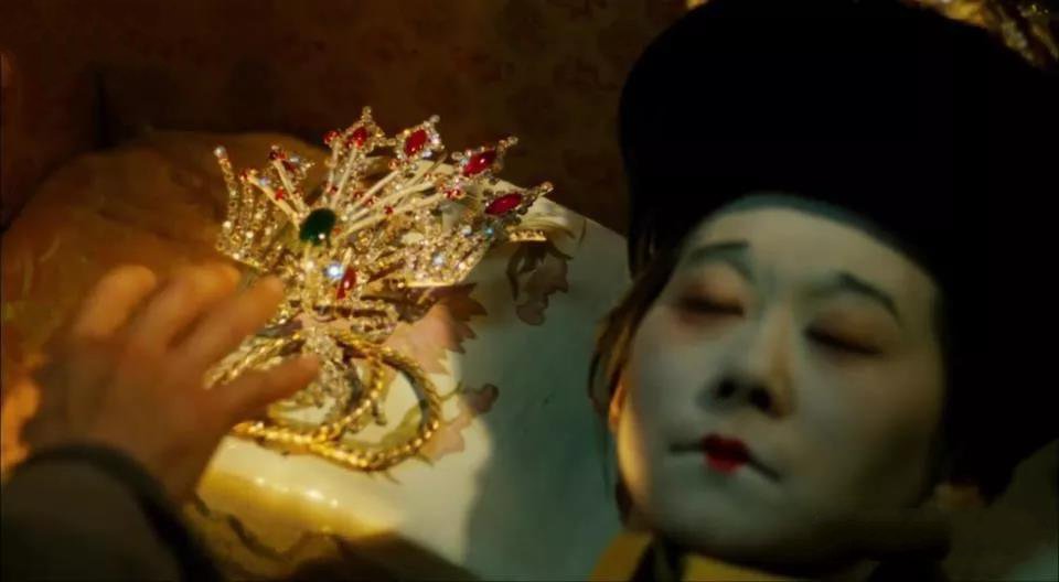 不过当年小的时候,看这部电影的时候,印象比较深的是,陈宝国饰演的鄂世臣一行人,进入棺椁内,盗墓贼用自己的脖子把尸体的脖子抬起来,摘下尸体脖子里的项链。还有就是盗墓贼盗墓成功后受了惊吓,看到自己的媳妇时出现幻觉,一回头成了尸体的样子。这些,都是童年阴影。