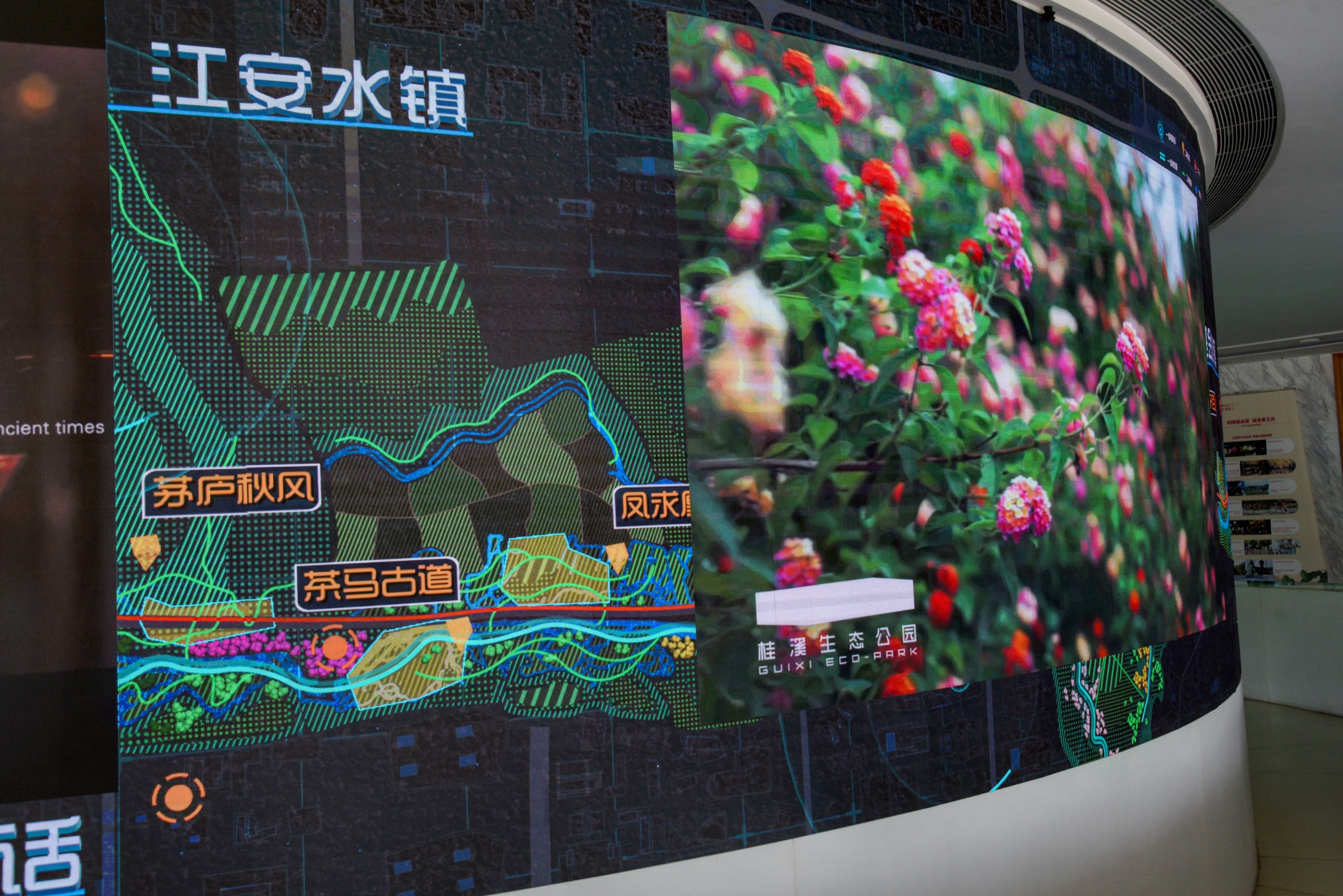 除了数据资料,在中心一楼还结合参观游线设置环形LED屏幕,通过VR技术及三维展示等方式,充分地向游客展示天府绿道规划建设成果,只需触碰桌上的屏幕,天府绿道其他段的名称、景点以及宣传片等内容就会在大屏幕上投影,让人一目了然,同时也更期待早日将各处的绿道串成,这样“花重锦官城”的美名也就会继续延续。