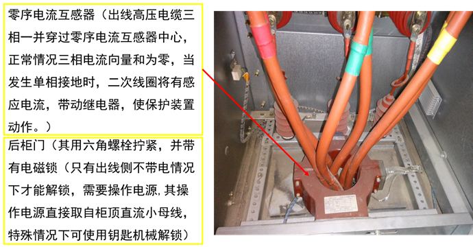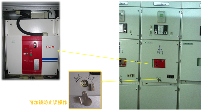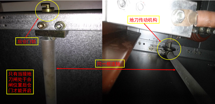只有当接地开关处于合闸状态时,开关柜的下门或电缆室的后封板才能打开。也只有在电缆室的后封板封闭时接地开关才可以分闸。
