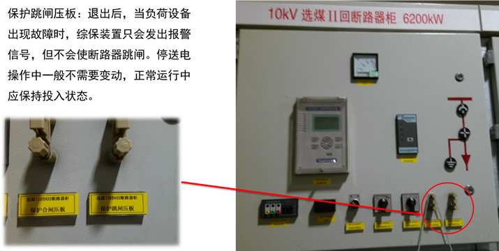 保护跳闸压板:退出后,当负荷设备出现故障时,综保装置只会发出报警信号,但不会使断路器跳闸。停送电操作中一般不需要变动,正常运行中应保持投入状态。