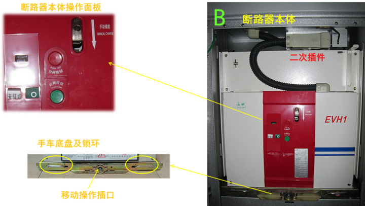 ③ 手车移动摇杆及移动操作插口:用于断路器在“工作、试验”两个位置的移动操作,将移动摇杆插入后,顺时针为将断路器推进,逆时针为将断路器摇出。