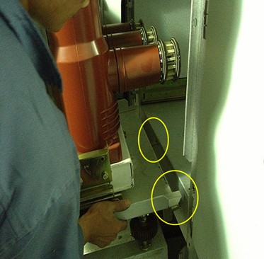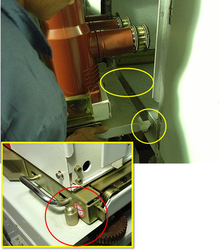 2、接地开关处于合闸状态时,接地开关操作轴上的联锁结构将阻挡手车移动,以使手车不能向工作位置推进。