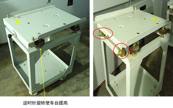 ②使检修小车定位杆对准开关柜上的定位孔,推动检修小车靠近柜体,使检修小车上锁勾勾在柜体上,调节检修小车托盘下的调节螺母,使检修小车的轨道与柜轨道相连接,双手握紧手车底盘锁环,先向内操作解除锁扣,再人力向外将手车拉出到检修小车上,手车底盘锁环应到达检修小车上的锁扣位置。