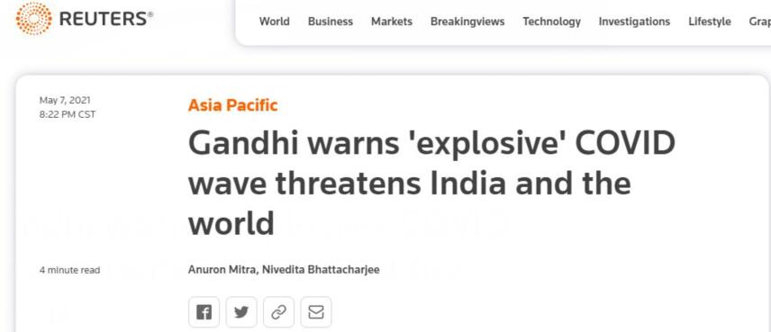 “这个星球上,每6个人中就有一个人的家在印度。这场疫情表明,我们的(人口)规模、遗传多样性和复杂性使印度成为病毒迅速变异的沃土,”甘地写道,“任由(新冠)病毒在我国不受控制地传播,不仅对我们的人民,而且对世界其他地区都将是毁灭性的。”