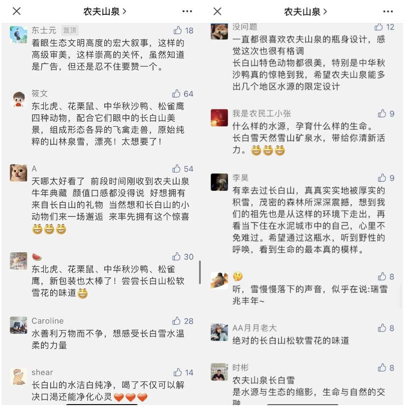此次,在农夫山泉的水源地纪录片中,珍贵的东北虎、花栗鼠、中华秋沙鸭、松雀鹰等生灵就出现在了农夫山泉的广告中。通过镜头的捕捉,每一帧幔的变化都格外优美,让人们有身临其境的体验感。
