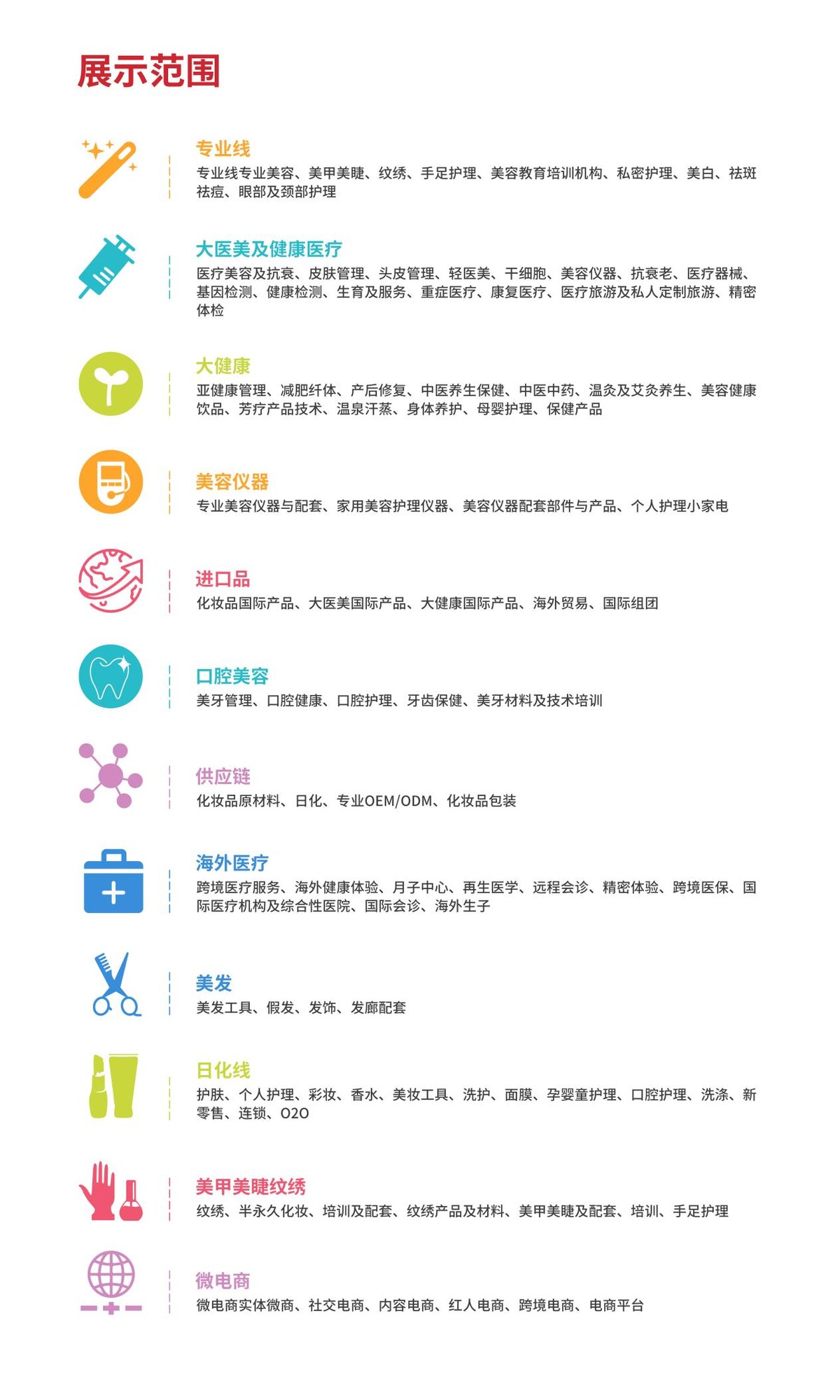 专业线、日化线、大医美及健康医疗、大健康、美容仪器、进口品、口腔美容、供应链、海外医疗、美发、三美、微电商,12+展览领域全产业链覆盖,围绕“年轻、时尚、跨界、融合”的时代主旋律。同时,集合美业青年创业者,打造高质量社交圈层,让创业者不再孤独。通过专业视角和精准的大数据推动行业创新发展,把握创业与资本投资的精密脉搏,为美业注入新力量。