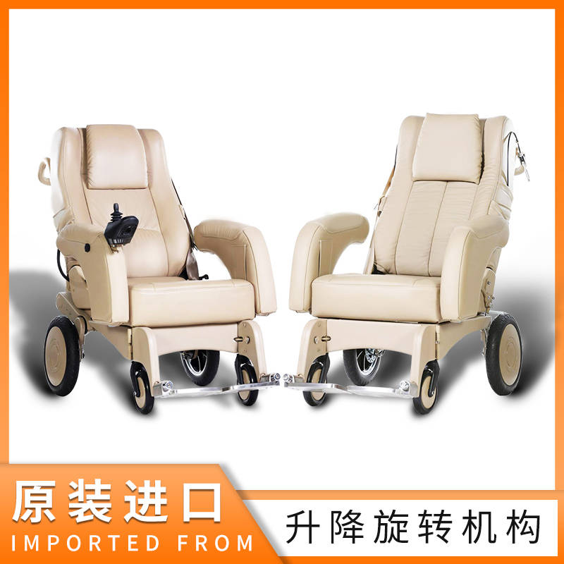 电动轮椅特点:真皮材质6公里每小时,时速5级电池使用2-3个小时,产品电压220V充电时长2小时,扶手可以上下调节脚踏为不锈钢可拆卸旋转,靠背可调节睡眠180度。枕劲可上下调节!电动轮椅通过操作杆控制操作!