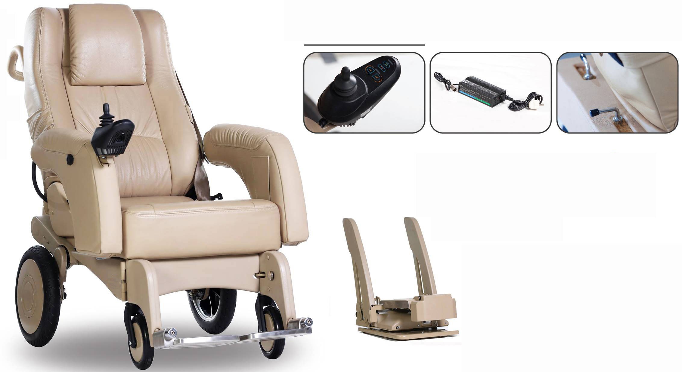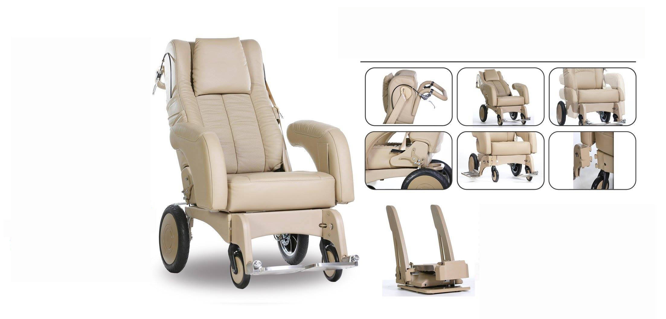 手动座椅特点:真皮座椅材质,重量48千克,扶手可以上下调节,脚踏为不锈钢可拆卸旋转,脱离车后可以作为独立轮椅!