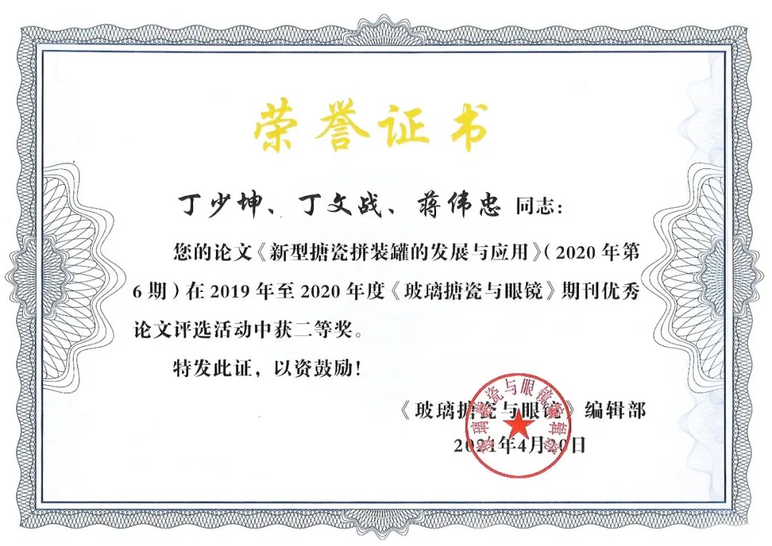 5月5日,《玻璃搪瓷与眼镜》(玻璃搪瓷版)2019-2020年度优秀论文评选活动颁奖仪式在东华大学隆重举行。本次评选活动意在推动行业科技进步,表彰优秀文章、作者为行业和期刊所做的贡献。经过重重筛选,由正中科技董事长、总经理与东华大学教授级高工蒋伟忠联合署名的文章《新型搪瓷拼装罐的发展与应用》在众多参选作品中脱颖而出,荣获二等奖。