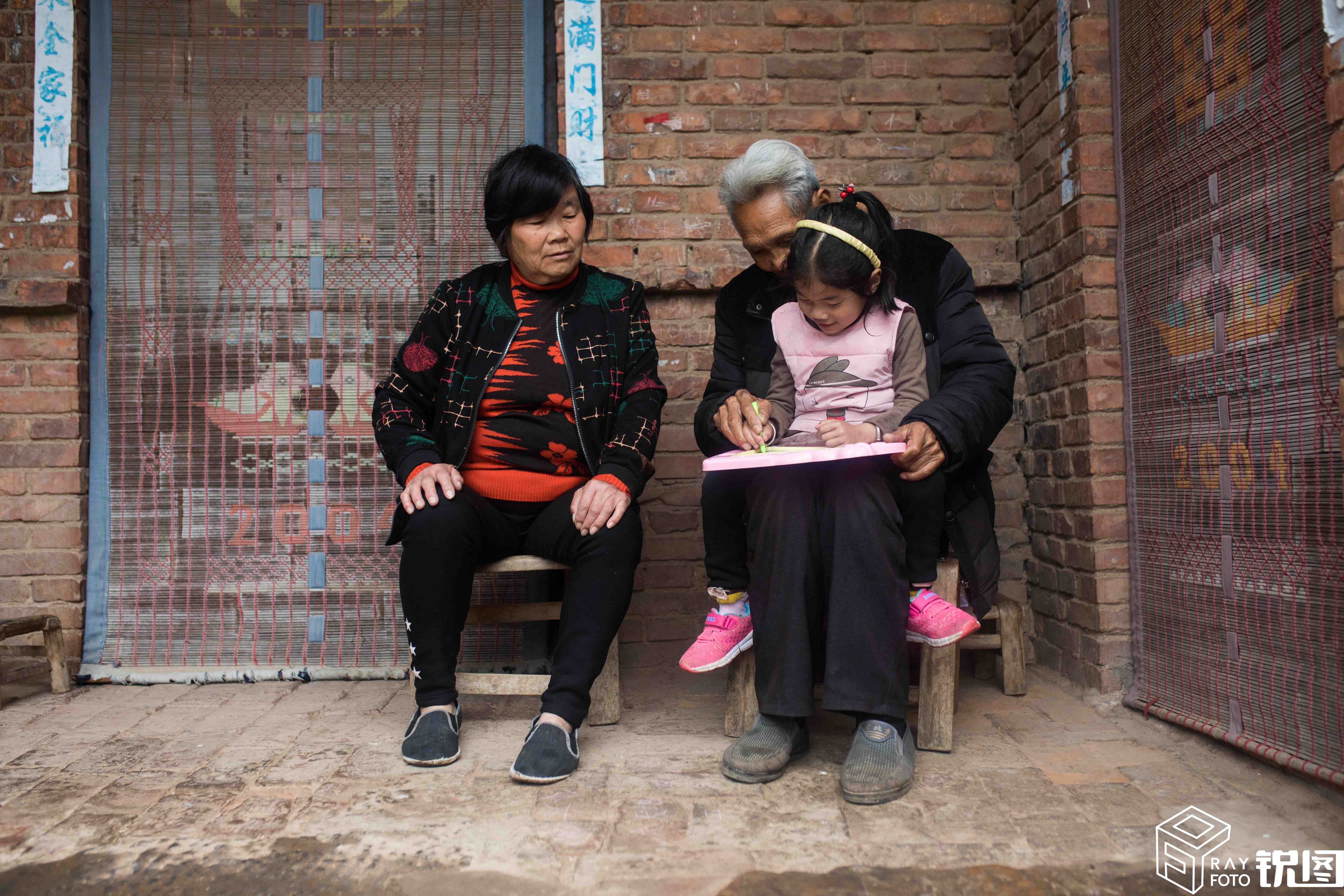 一家人坐在屋檐下,有说有笑,脸上挂满笑容。