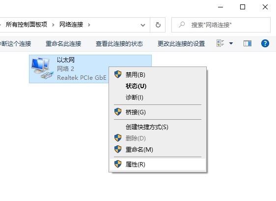 3、右键点击“以太网”或“本地连接”—属性,如果是WIFI就选择无线网络的属性。