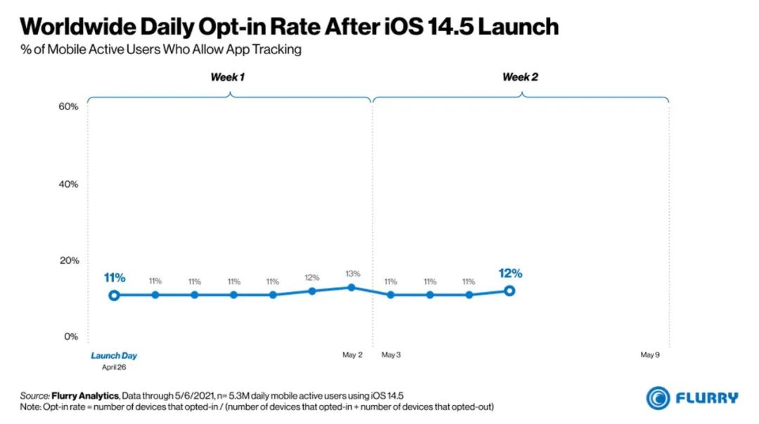 如果将调查基数扩大到全球 530 万活跃的 iOS 用户中,选择「允许应用跟踪」的比率便提高到了 12%。
