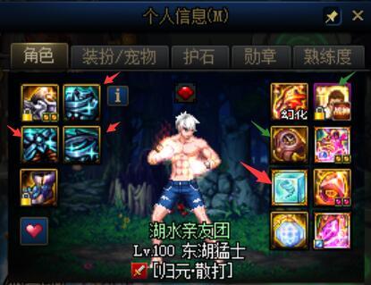 红箭头所指为较易获取的必选装备(魔战3减cd30%、聚魔旋涡),绿箭头所指为量力而行的备选装备(ss时间手镯10%,神话手镯15%,cd称号10%),头肩鞋子可用来延长一觉持续时间,仅供有需要的玩家参考。这样的一套cd换装在吃刺激药情况下可以将一觉cd缩短为45s左右。