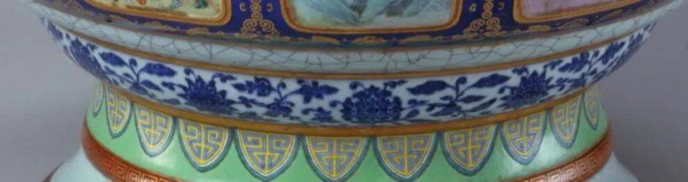 瓷母自上至下所装饰的釉彩多达10余层。给人直观的第一个感觉,就是两个字:漂亮。他所使用的“釉上彩“有:金彩,粉彩,洋彩珐琅彩。“釉下彩”有青花,还有釉上和釉下相结合的斗彩。所使用的釉,有仿哥釉、仿钧釉、仿汝釉、仿官釉、松石绿釉、粉青釉、霁蓝釉、酱色釉。各种釉色之间用一道金彩或青花相隔,让这件瓷器显得既富丽堂皇,而又不失节奏感。
