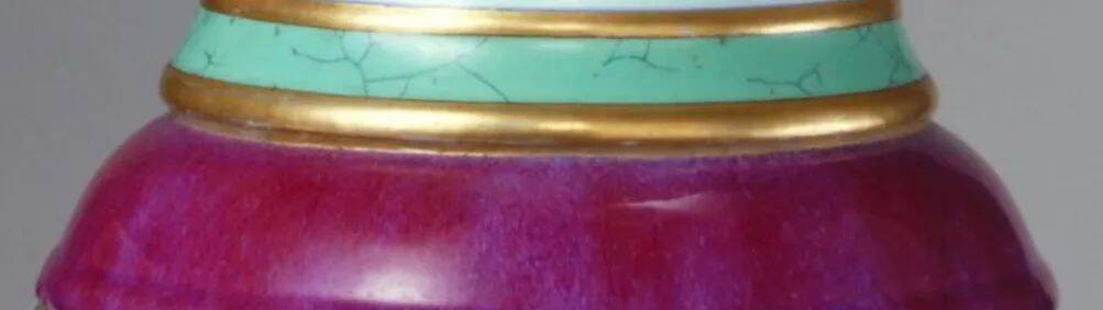 接下来第三层纹饰,装饰采用了仿哥釉的技法,哥窑大家知道,是中国古代五大名窑之一,哥窑俗称百圾碎,他的特点就是金丝铁线、紫口铁足。