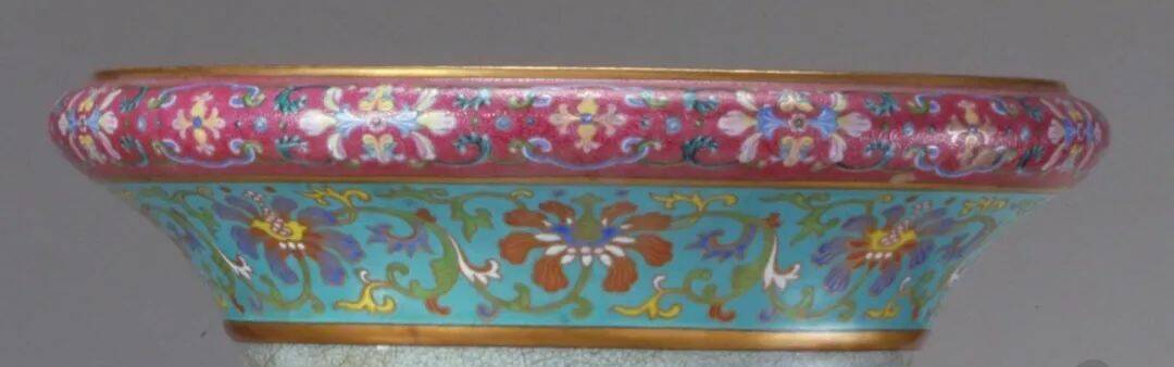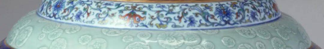 瓷母的第二层纹饰装饰为“洋彩 绿地缠枝花卉”这里面采用了乾隆时期的另一个新的技艺,就是仿生瓷技术。仿生瓷指的是用陶瓷去模仿其他材质的器物。这件瓷母的第二层,模仿的是铜胎掐丝珐琅,俗称景泰蓝。
