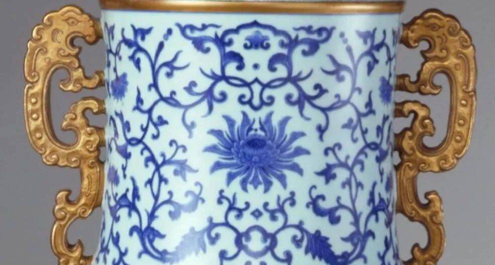 到了第四层纹饰,就是典型乾隆官窑的青花缠枝花卉。上面所用的青花,发色青翠,沉着稳定,层次清晰。在第四层纹饰的左右两侧,也就是瓶颈的部位,分别装饰有金彩夔龙纹双耳,夔龙纹双耳是仿汉代玉器造型,精工细作,工艺精湛。