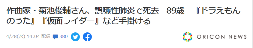 4月28日,经日本音乐著作权协会 (JASRAC) 确认,曾为《哆啦A梦》、《假面骑士》等多部作品创作主题曲的作曲家菊池俊辅于本月24日因吸入性肺炎去世。