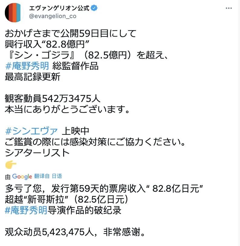 在《新世纪福音战士新剧场版:终》上映的第59天,它的日本院线票房收入已达82.8亿日元,超过《新哥斯拉》82.5亿日元的票房数据,成为庵野秀明导演的新票房纪录。
