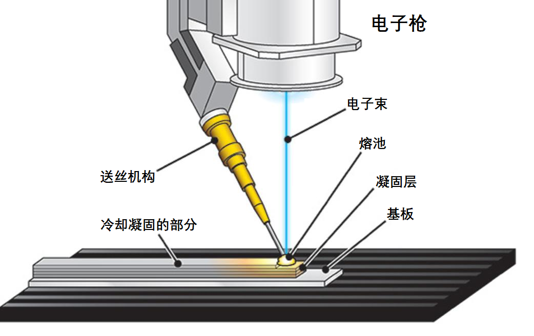 其技术原理如下:在真空环境中,高能量密度的电子束轰击金属表面形成熔池,金属丝材通过送丝装置送入熔池并熔化,同时熔池按照预先规划的路径运动,金属材料逐层凝固堆积,形成致密的冶金结合,直至制造出金属零件或毛坯。
