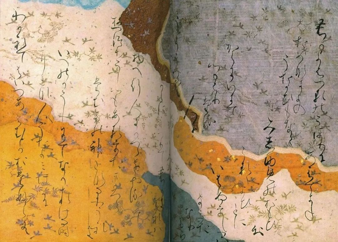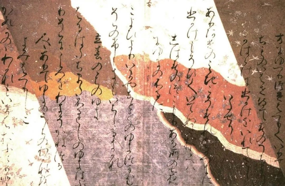 当时日本天皇过生日时,贵族用假名把自己喜欢的诗歌写在纸上,进献给天皇作礼物。这些都是很美丽的作品,我们在上面可以看见无限的色彩,还有金银纸屑粘在上头。