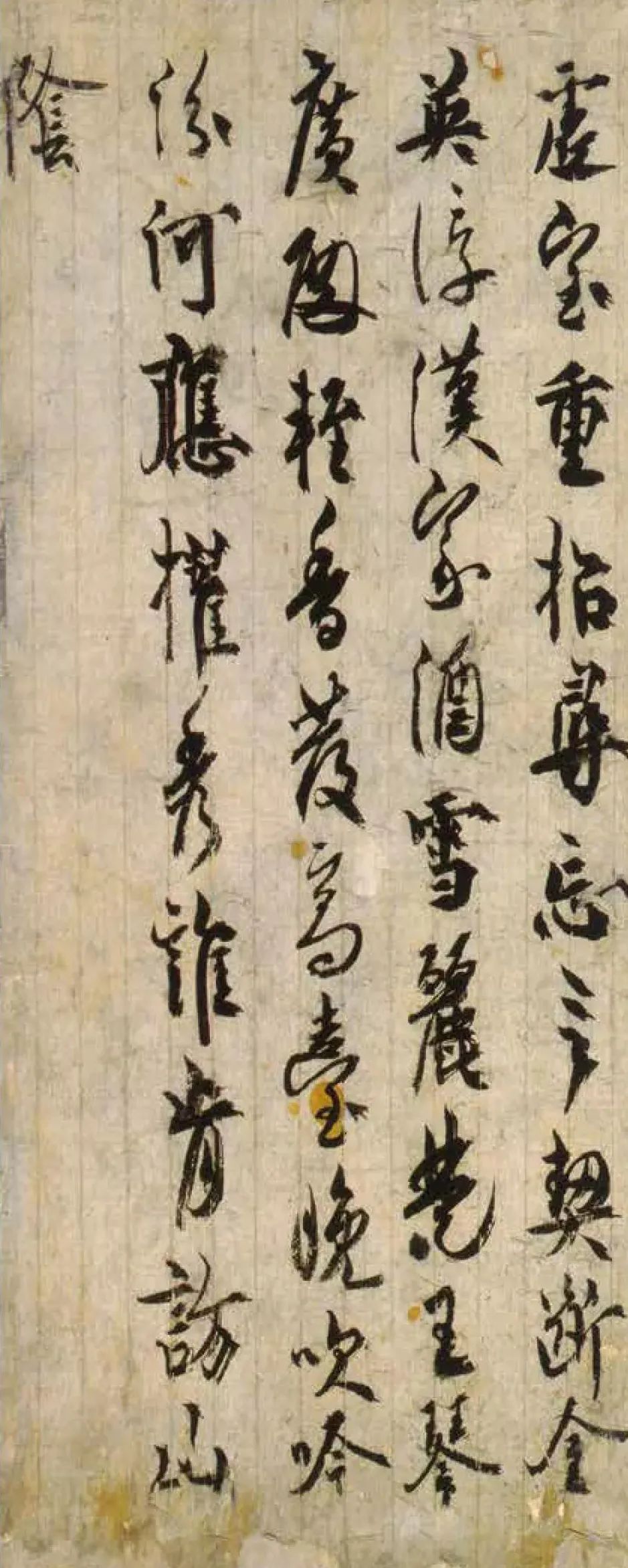 日本人很喜欢用小草做装饰 ,即使是皇家,也都会用这种装饰,就是这种小小的、很平常的、随手可见的东西,然后他们用爱心和金、银把它们拼出来并画在纸上,再在美丽的“色纸”上书写。这个《室町切》,从第一个“山”字以下,一口气连下来,美得不得了,很精彩,但基本上没有用笔的提顿、中锋用笔,字与字之间联系得比较紧密。