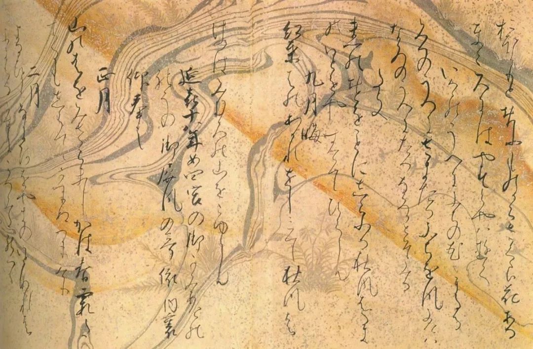 西本愿寺所藏《贯之集》的书法在纸上呈现了一种油水混合物的效果。它的做法是把纸平平地铺放在一盆水上面,水的上面有油的颜色,再将纸拿起来的时候,上面就会有水流动的感觉。纸上面也画了小草。