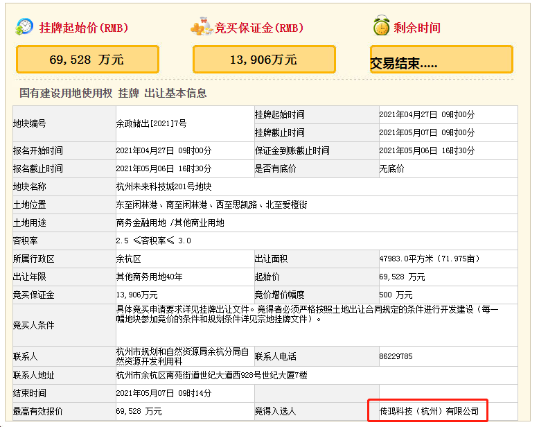 该地块东至闲林港、南至闲林港、西至思凯路、北至爱橙街,传鸿科技(杭州)有限公司以69528万元成交。