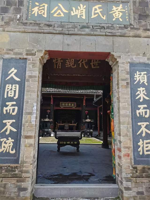 黄氏峭公祠迄今已有百余年的历史了,祠为砖木结构的四合院式天井院,坐东北,朝西南,硬山顶,三山式斗砖封火马墙,穿斗式构架,单进殿,面开五间,为18.7米,进深共28.1米,有正厅、天井、廊道和下廊,左右各有一厢房,雕梁画栋,穿斗式梁架,正厅供有黄峭及三夫人、二十一子牌位。主体建筑完整,具有明显的清代建筑风格,古朴且具地方特色。