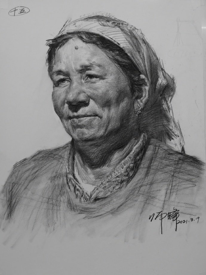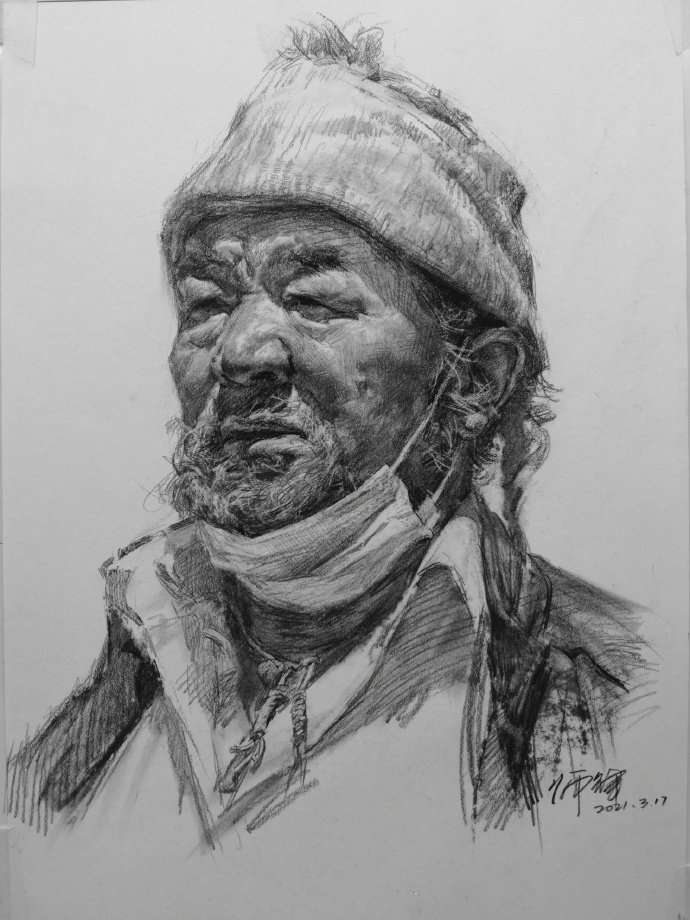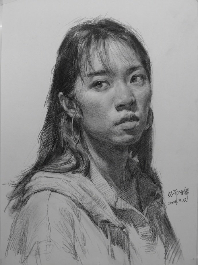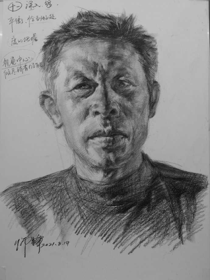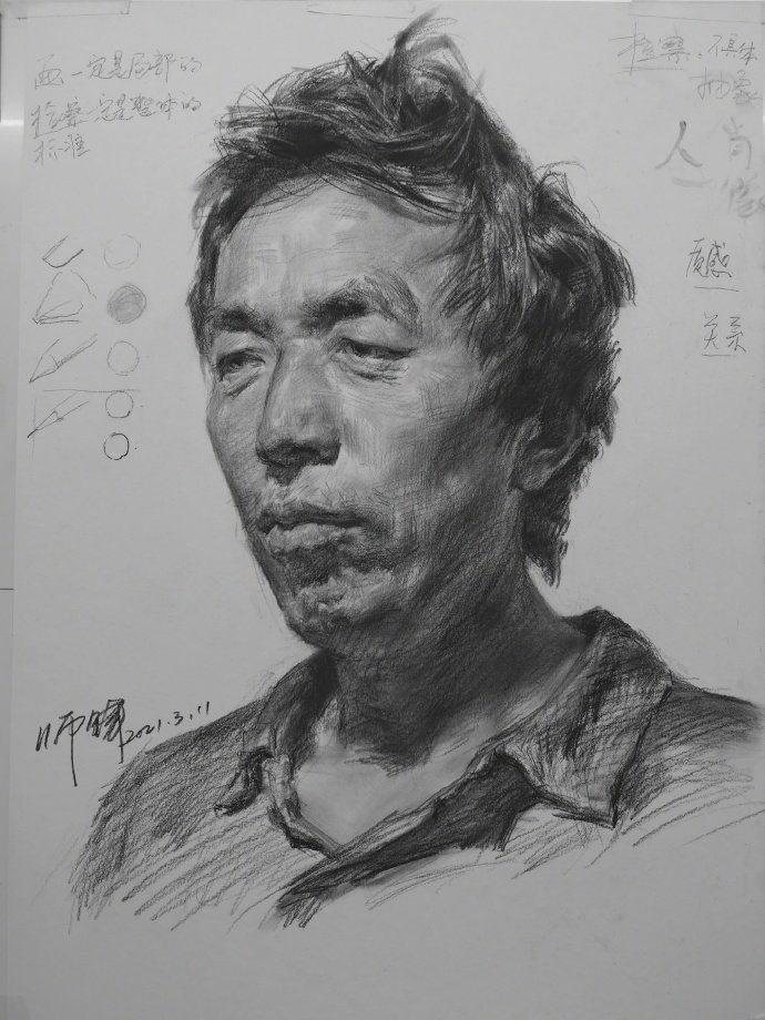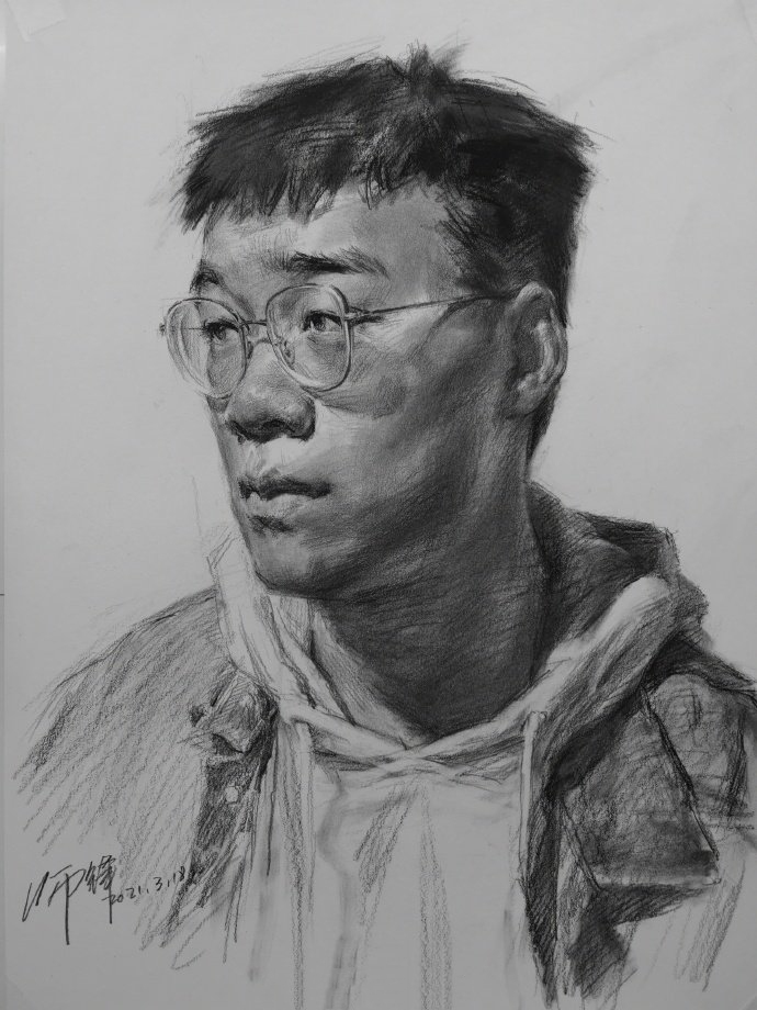 在素描头像中,画面整体气氛要统一和谐,要节奏明确,突出重点,面部的明暗交界线要连贯,切勿破碎。五官的颜色较重,一定要注意五官各个重色之间的区别。