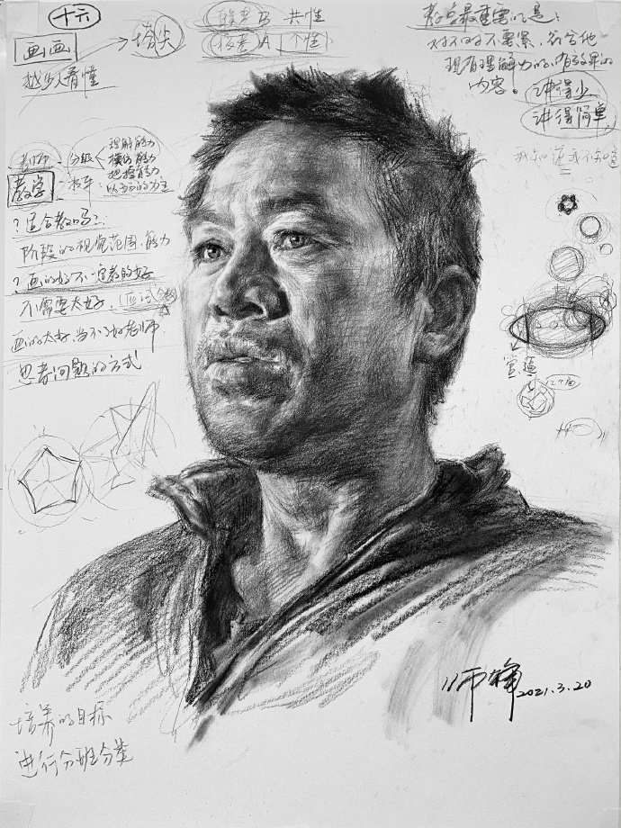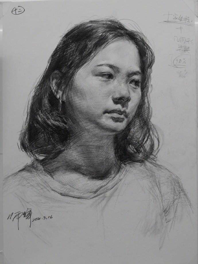 在画的时候,应该注意灰调子与暗面、反光的差别,中间的灰部是亮面的一部分,而反光是暗面的一部分,很多同学为了使画面更加突出,会进行加重,但往往是无用功,因为同学们在加重暗部的同时也会加重亮部和灰部,三部分同时加重的结果就是,等于没加重,甚至会更灰。要明确,画面太灰不是因为不够黑,而是黑白灰关系没拉开,对比不明确。