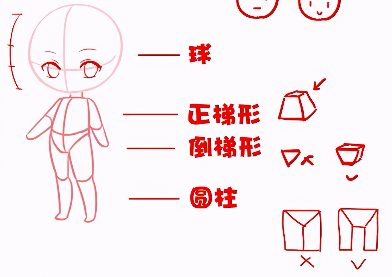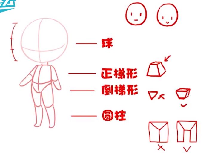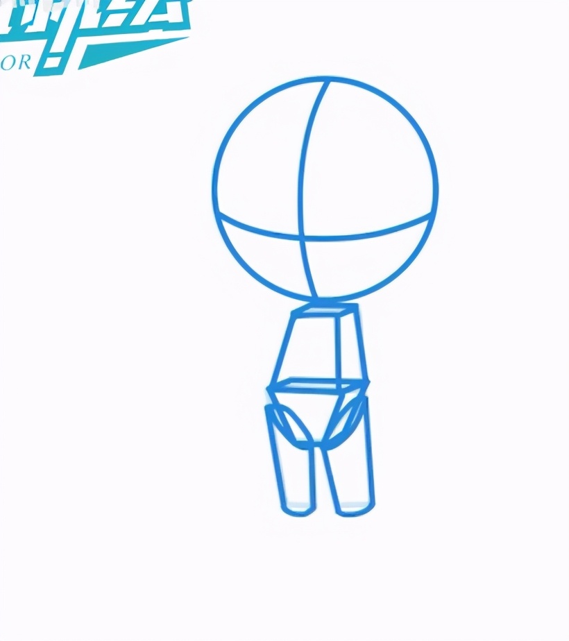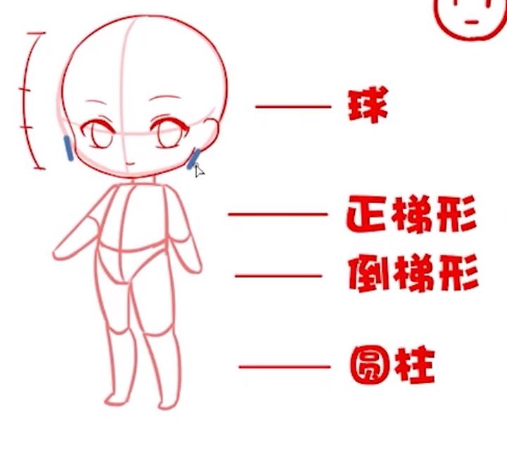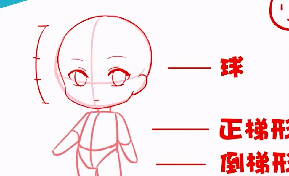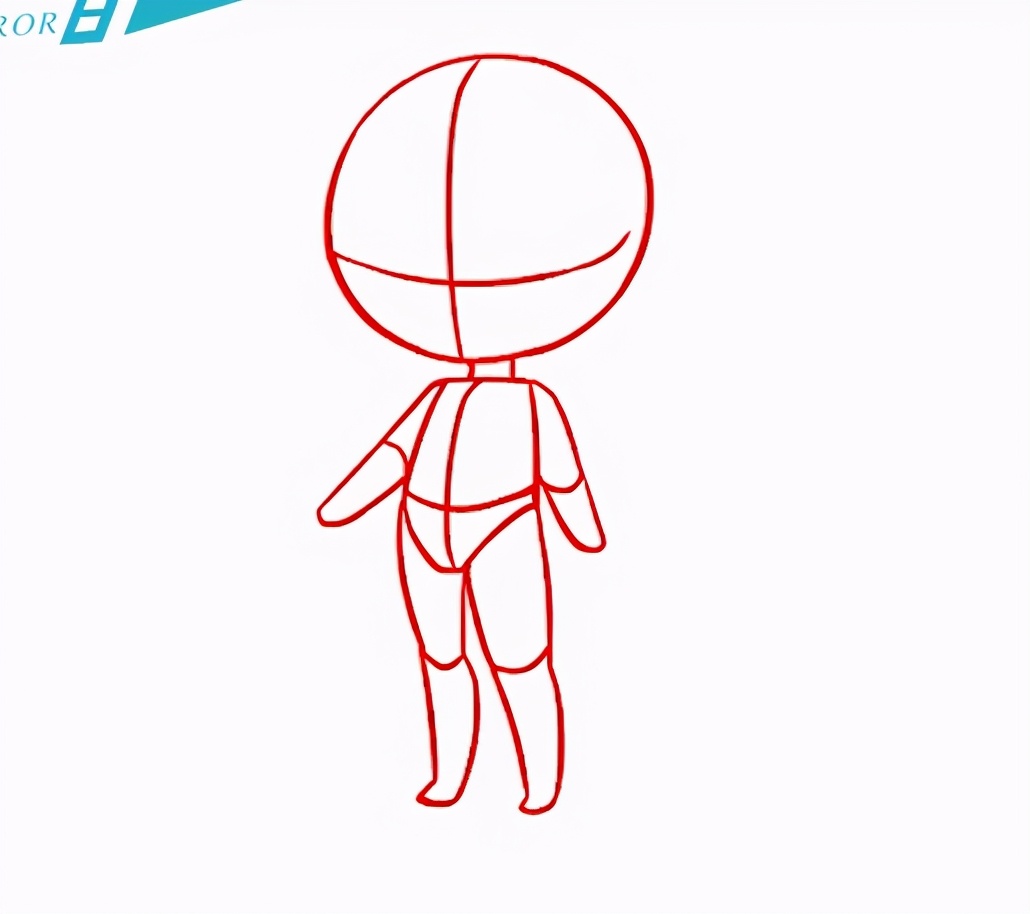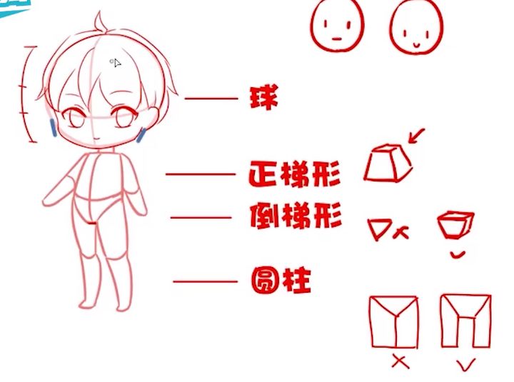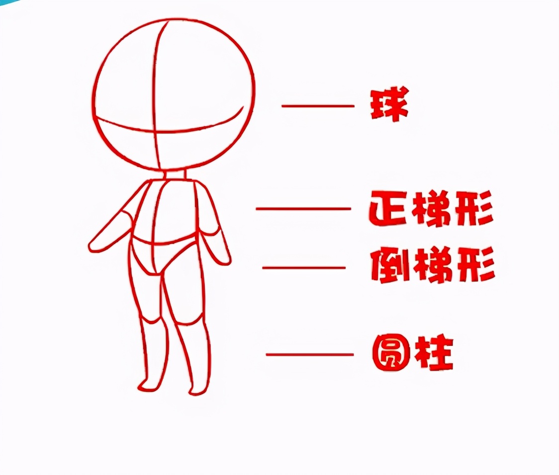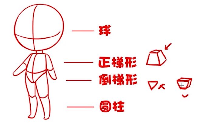 在画Q版一开始可以先用圆来代表头部,然后用梯形代表身体还有胯部